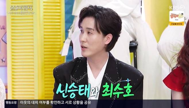 이찬원 역시 "찐친(진짜 친구) 사이?"라고 묻는 상황. 최수호가 "찐사랑"이라고 하자 김준현은 "세 글자를 두 글자로 왜 줄여?"라고 이해하지 못하기도. 최수호는 "워낙 승태 형이 젊게 산다"고 했고, 신승태는 "제가 '현역가왕2'에서도 제일 친했던 게 (27년 차이 나는) 황민호다. 이제 6학년 올라가는데"라고 말했다. '불후의 명곡'에 첫 출연한 최수호는 지드래곤의 '투 배드'로 댄스 개인기를 선보였다.