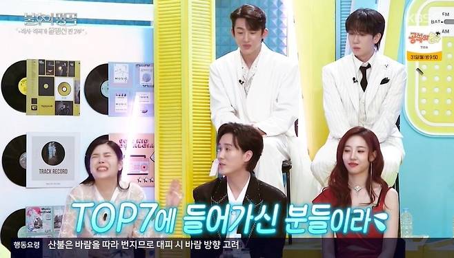 그런 가운데 신승태, 최수호는 '현역가왕2'에서 각각 4위, 6위를 차지했다고 밝혔다. 이에 신유가 벌떡 일어나 "전 10위 했다"고 하자 신승태는 "굉장히 가시방석이다"라고 말하기도. 이찬원은 신승태, 최수호 나이 차이가 16살이라고 말하며 "세대 차이 느끼지 않냐"고 물었다. 신승태는 "전 안 느끼는데, 자꾸 벽을 만들더라. 신조어를 아냐고 자꾸 물어보고"라고 서운해했다. 이에 최수호가 "다혜 선배님이 말할 때도 제가 '찐사(진짜 사랑)'라고 했는데"라고 말을 꺼내자 스튜디오에는 순간 정적이 찾아와 웃음을 안겼다.