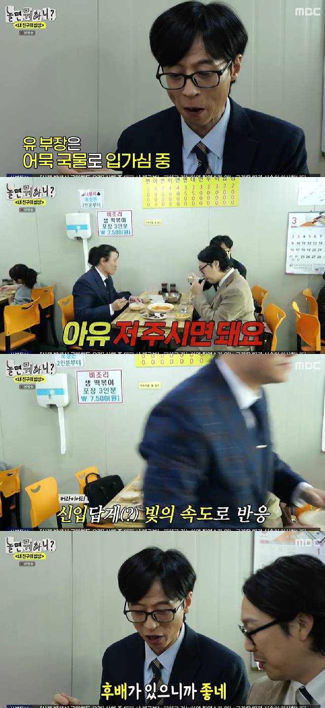 이어 유재석이 단무지를 찾자 임우일은 또다시 빠른 행동력을 보여 웃음을 자아냈다. 유재석은 "역시 코미디언 직속 후배라 엉덩이를 못 떼게 만든다"며 칭찬했다.
