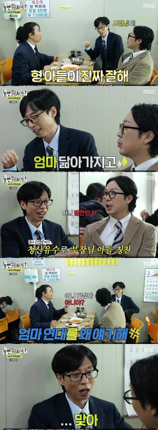 이에 유재석은 "엄마 연대를 왜 얘기하냐"고 발끈했고, 하하의 "아니야?"라는 반문에 "맞다"고 인정했다.