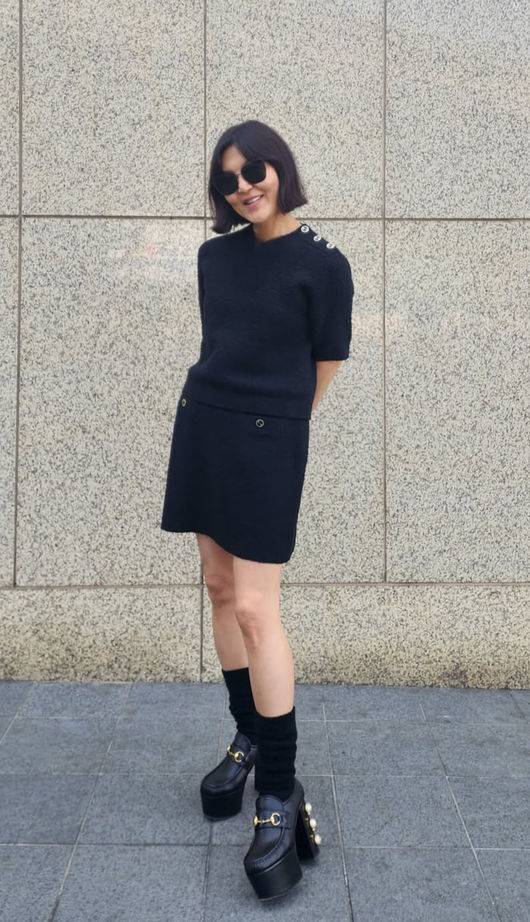 한혜연은 G 브랜드의 시그니처 장식이 눈에 뜨이는 굽 높은 로퍼를 신었다. 진주 장식이 로퍼의 굽을 장식하고 있어서 G 브랜드 특유의 화려함을 뽐냈다. 이에 한혜연은 깔끔한 블랙 니트와 스커트를 매치해 신발에만 포인트를 주는 센스를 발휘했다.