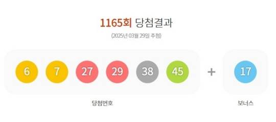로또복권 운영사 동행복권은 제1165회 로또복권 추첨에서 '6, 7, 27, 29, 38, 45'가 1등 당첨번호로 뽑혔다고 29일 밝혔다. 2등 보너스 번호는 '17'이다.