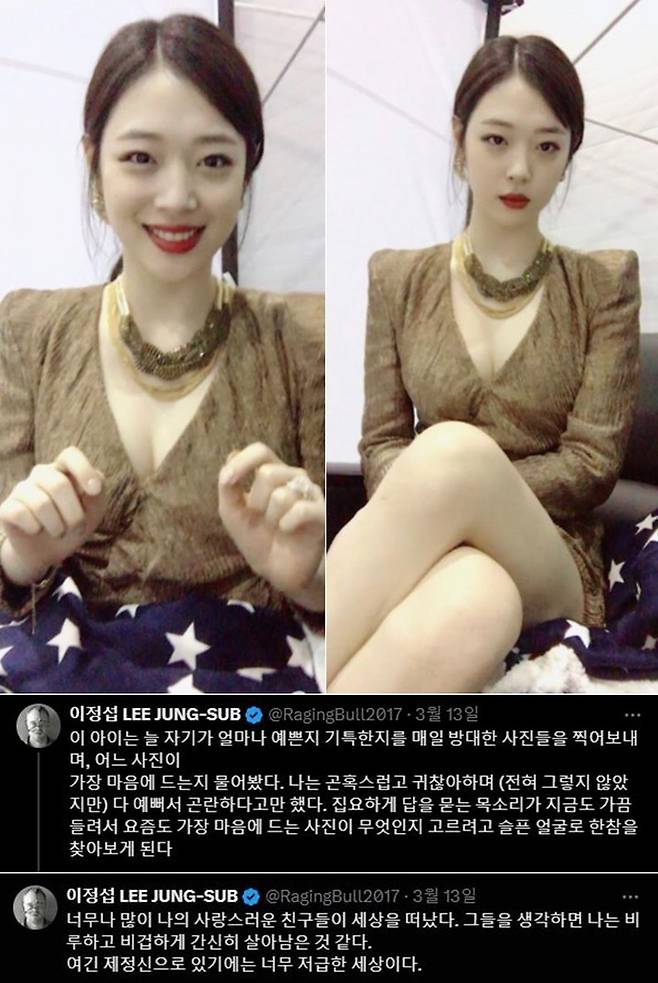 13일 설리의 사진 여러 장을 올리며 "이 아이는 늘 자기가 얼마나 예쁜지 기특한지를 매일 방대한 사진들을 찍어보내며, 어느 사진이 가장 마음에 드는지 물어봤다. 나는 곤혹스럽고 귀찮아하며 (전혀 그렇지 않았지만) 다 예뻐서 곤란하다고만 했다. 집요하게 답을 묻는 목소리가 지금도 가끔 들려서 요즘도 가장 마음에 드는 사진이 무엇인지 고르려고 슬픈 얼굴로 한참을 찾아보게 된다"라는 글로 고인을 추억하기도 했다.