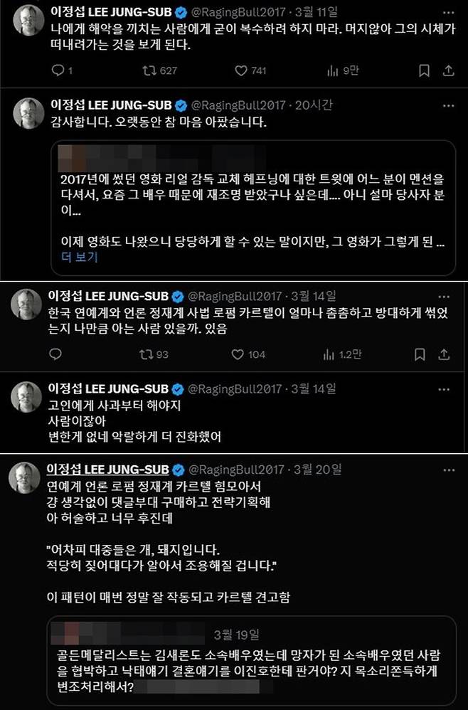 그러자 같은날 이 감독은 "고인에게 사과부터 해야지. 사람이잖아. 변한 게 없네. 악랄하게 더 진화했어"라고 강도 높게 비난의 목소리를 냈다. 그러면서 "한국 연예계와 언론, 정재계 사법 로펌 카르텔이 얼마나 촘촘하고 방대하게 썩었는지 나만큼 아는 사람 있을까"라고 덧붙였다.