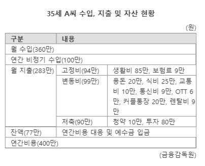 35세 A씨 월 수입은 360만원이다. 이와 별도로 들어오는 연간 비정기 수입은 100만원이다. 월 지출은 283만원이다. 고정비가 94만원으로 생활비(85만원)와 보험료(9만원)가 나간다. 변동비는 용돈(20만원), 식비(25만원), 교통비(10만원), 통신비(9만원), OTT(6만원), 커플 통장(20만원), 정수기 등 렌탈비(9만원) 등을 합쳐 99만원이다. 저축은 청약(10만원), 투자(80만원) 등 90만원씩 하고 있다. 잔액(77만원)은 연간비용(400만원)에 대응하는 데 쓰거나, 예수금으로 입금하고 있다.