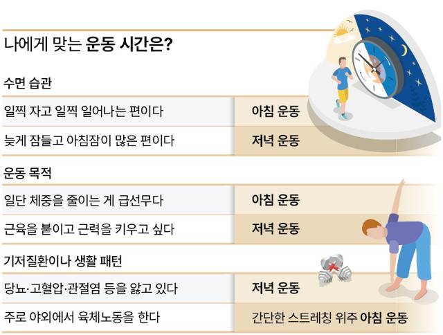 운동은 아침과 저녁 중 언제 하는 게 좋을까. 약속이 잦은 저녁 대신 새벽에 움직이는 게 나을까. 하루 일과를 마친 저녁에 하고 꿀잠을 청하는 게 더 효과적일까. 김지형 서울대학교 정형외과 교수의 도움말로 알아본다.