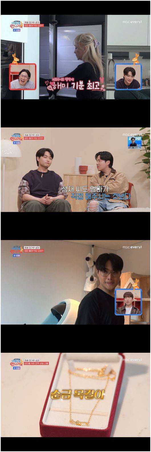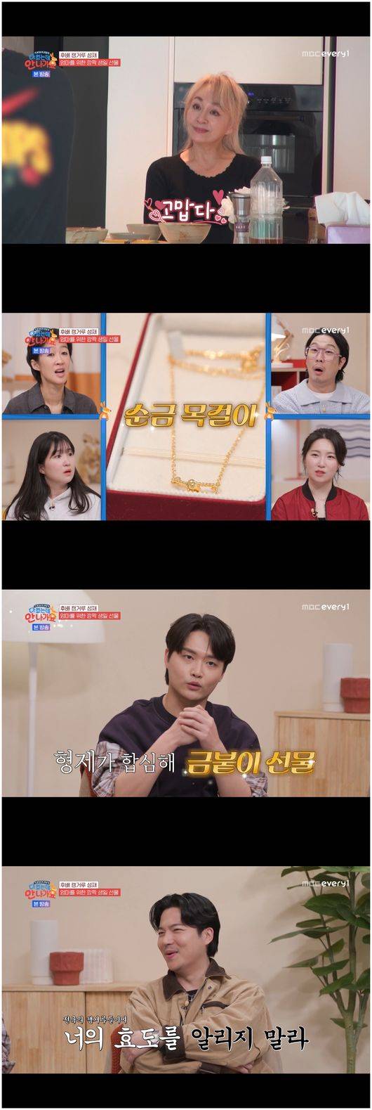 그런 황성재의 손에서 목걸이 케이스가 등장했다. 남창희는 “제대로 금이네?”라며 놀랐다. 황성재는 “박해미가 악세서리는 많은데, 리얼 금이 없다. 그래서 형이랑 둘이 3년 전부터 돈을 모아서 금을 사드리고 있다”라고 말했다.