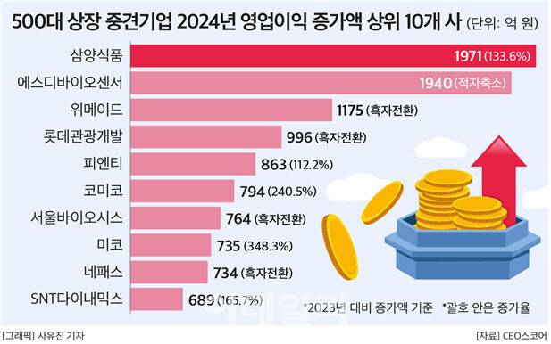 중견기업 중 지난해 매출이 가장 크게 증가한 곳은 5351억원 늘어난 삼양식품이었다. 이어 △피엔티(4897억원) △서진시스템(4351억원) △일진전기(3305억원) △우신시스템(3214억원) △성도이엔지(3210억원) △파트론(3140억원) △하나마이크론 (2827억원) 순으로 매출 증가 규모가 컸다.