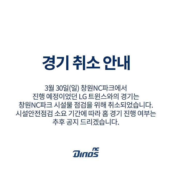 갑작스럽게 벌어진 사태에 모두가 깜짝 놀랐다. 이날 오후 8시45분경 NC 구단은 보도자료를 내고 "3월 30일 창원 NC파크에서 진행 예정이었던 LG 트윈스와의 경기는 창원 NC파크 시설물 점검을 위해 취소됐다"고 공식 발표했다. 이어 "시설 안전 점검 소요 기간에 따라 홈 경기 진행 여부는 추후 공지한다"고 밝혔다. 곧이어 KBO도 "3월 30일 창원에서 개최 예정인 NC와 LG의 경기를 연기하기로 했다. 29일 창원 경기에서 구조물 낙하 사고로 인해 관중 3명이 부상 당하는 부상사가 발생함에 따라, NC 구단과 협의해 시설물 안전 점검 실시를 위해 이를 결정했다"고 발표했다.