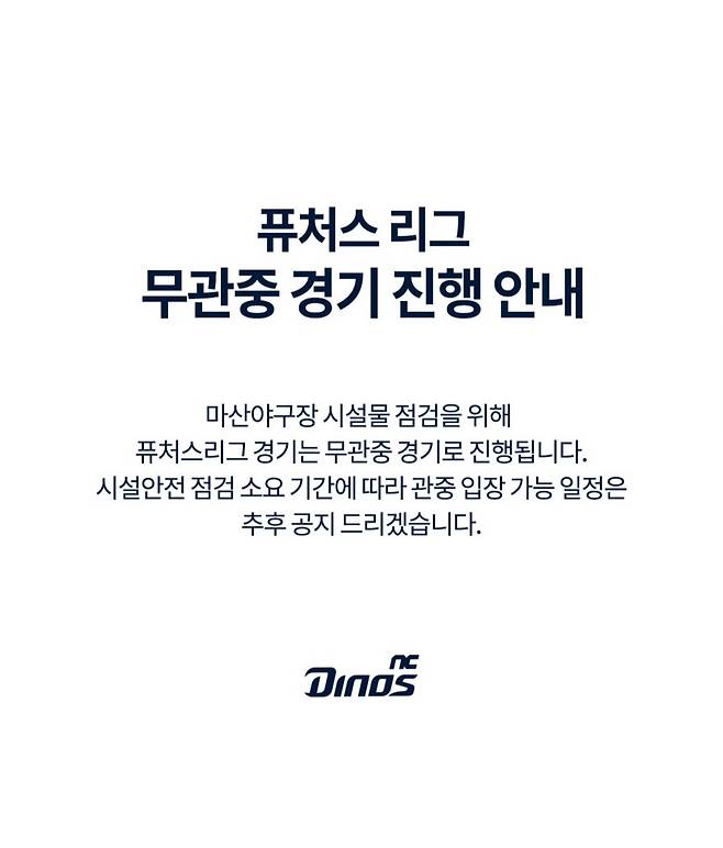 NC 구단은 1군 구장인 NC파크 뿐만 아니라 바로 옆에 위치한 2군이 사용하는 마산야구장 역시 시설물 점검에 들어간다면서 "퓨처스리그 경기는 무관중 경기로 진행된다. 시설 안전 점검 소요 기간에 따라 관중 입장 가능 일정은 추후 공지하겠다"고 발표했다.