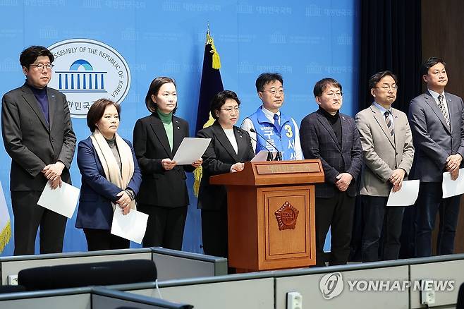 (서울=연합뉴스) 김주성 기자 = 조국혁신당 김선민 대표 권한대행이 30일 서울 여의도 국회 소통관에서 탄핵심판 선고기일을 미지정한 헌법재판소의 재판관을 상대로 한 '전국민 화병 위자료 청구 집단소송' 추진 계획을 설명하는 기자회견을 하고 있다. 2025.3.30