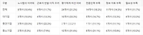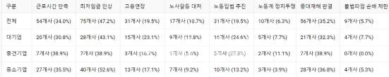 대기업 또한 최저임금 인상(43.1%, 28개사)에 대한 우려가 가장 컸고 이어 중대재해 법원 판결(32.3%, 21개사)가 뒤를 이었다. 중견기업은 근로시간 단축과 중대재해 법원 판결이 동일한 비율(38.9%, 7개사)로 가장 많았다.