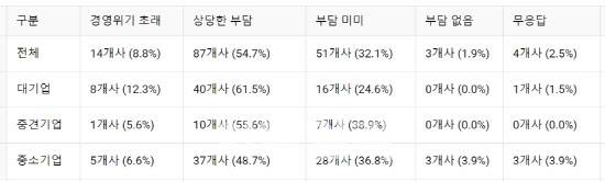 ‘심각한 경영위기를 초래할 것’이라고 응답한 기업 중 대기업 비중은 12.3%(8개사), ‘상당한 부담이 될 것’이라는 응답 중 대기업 비중은 61.5%(40개사)로 두 질문에서 모두 대기업이 가장 많았다.