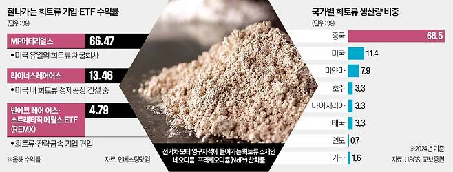 증권업계는 특히 MP머티리얼스를 주목하고 있다. 이 회사는 미국 캘리포니아주의 마운틴 패스 광산을 보유하고 있는 미국 내 유일한 희토류 채굴 기업이다. 희토류 채굴뿐만 아니라 정제, 제련 공정까지 갖췄다. 또 다른 희토류 생산 기업 라이너스레어어스의 주가도 상승세다. 2020년부터 미국 국방부 자금을 지원받아 텍사스주에 희토류 처리 공장을 건설하고 있다. 증권업계 관계자는 “중국은 전 세계 희토류 생산에서 차지하는 비중이 69%, 제련 비중은 90%로 사실상 독점 체제를 구축했다”며 “이 시장을 나눠 갖는 기업을 눈여겨볼 필요가 있다”고 말했다.