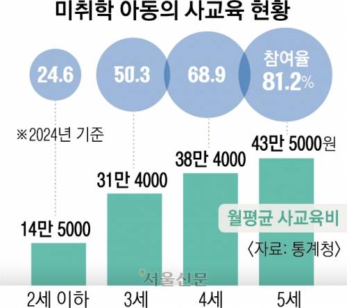 영어유치원, 초등학생을 대상으로 하는 의대반 등 어린 나이에 시작되는 사교육은 강남만의 일이 아니다. 초등학교 3학년생과 유치원생까지 두 아들을 키우는 김모(39)씨는 “둘째를 영어유치원으로 옮기면서 아이들 교육비로 한 달에 320만~330만원이 나간다”며 “영어유치원만 해도 월 140만원 수준”이라고 전했다. 경기 고양시에 사는 박모(38)씨도 하나뿐인 유치원생 딸을 영어·수학·미술·태권도 학원에 보내고 있다. 박씨는 “영어유치원은 너무 비싸서 엄두가 안 나고, 유치원 하원 이후 퇴근할 때까지 여러 학원을 보내고 있다”며 “한 달 학원비만 100만원 정도”라고 했다. 실제로 교육부의 ‘2024 유아 사교육비 시험조사’ 결과를 보면 지난해 7~9월 국내 6세 미만 미취학 아동의 1인당 월평균 사교육비는 33만 2000원으로 집계됐다.