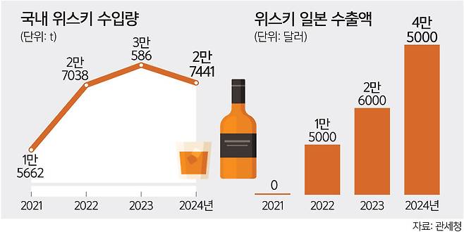 상품성을 인정받으면서 국산 위스키 시장도 커질 것으로 보인다. 관세청 수출입통계를 보면 지난해 일본으로 수출한 위스키 규모는 4만5000달러(약 6600만원)로 전년(2만6000달러)보다 73% 이상 늘었다.