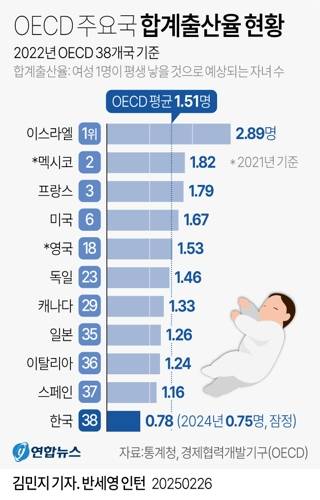 한국의 합계 출산율은 2021년 0.81명, 2022년 0.78명, 2023년 0.72명으로 계속 떨어지다 지난해 0.75명으로 9년 만에 반등하긴 했지만 인구 절벽 위기에서 벗어나기까지는 아직 갈 길이 멀다는 분석이 많다.