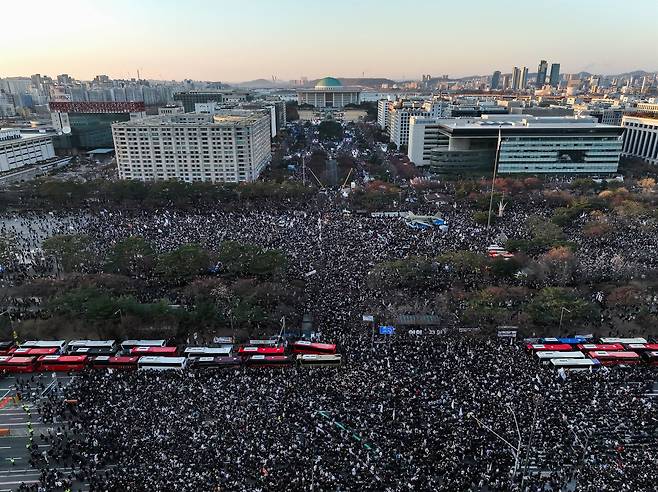 | ▲ "우리 국민들은 이미 민주주의의 아이들이 됐다. 독재가 필요로 하는 국민이 없다. 저항이 극심할 거다. 군인, 경찰, 일선에 나온 사람들 다 젊다. 대학, 노동단체, 시민단체가 쉽게 굴복하겠나. 결국 어떤 방식으로든 극복된다. 제일 효율적이랄까, 비용을 덜 들이는 방식이 헌재다. 여기서 끊어야 한다." 윤석열 대통령 탄핵소추안이 국회에서 처리된 2024년 12월 14일 오후, 서울 여의도 국회앞, 여의도공원, 여의대로, 여의도역까지 탄핵안 가결을 촉구하는 시민들로 가득하다. |