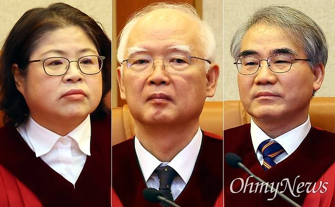 | ▲ "한덕수 결정문은 사실상 7대 1이다. 제가 30년 간 법대에서 가르쳤는데, 정계선 재판관 딱 한 명만 법률가가 쓸 수 있는 글을 썼다. 나머지 7명은 로스쿨 학생이었으면 과락(科落)이다. 왜 그랬을까?" 김선택 명예교수는 <오마이뉴스> 인터뷰에서 "재판관 일부가 오염된 것"이라고 말했다. 사진 왼쪽부터 김복형·정형식·조한창 헌법재판관 |
