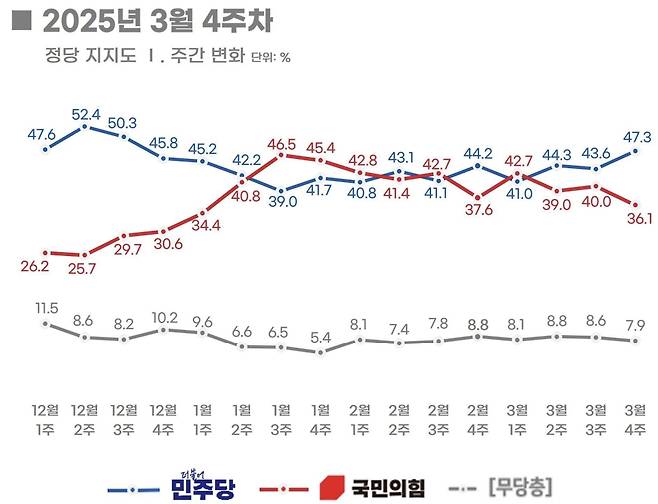 국힘 36.1%, 민주 47.3%…오차범위 밖 벌어져[리얼미터]