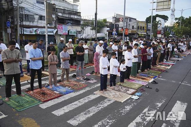 [자카르타=AP/뉴시스] 31일(현지 시간) 인도네시아 자카르타 거리에서 무슬림들이 라마단 성월의 끝을 알리는 이드 알피트르 기도를 올리고 있다. 2025.03.31.