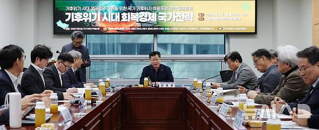 [서울=뉴시스] 조성우 기자 = 더불어민주당 소속 국회 환경노동위원회 안호영(가운데) 위원장이 31일 오전 서울 여의도 국회 의원회관에서 열린 기후 위기 시대 생태문명 전환을 위한 국가 기후 위기 적응포럼 연속 대토론회에서 인사말을 하고 있다. 2025.03.31. xconfind@newsis.com
