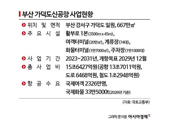 개항 목표는 2029년 12월이다. 신공항에는 16.5㎞ 길이 복선 철도와 4차로 도로가 연결된다. 부산 도심과 직접 연결되는 교통망은 현재로선 부산시가 추진 중인 민자 급행철도(BuTX)가 유일하다. 개통 시 부산역~공항 간 소요 시간은 17분으로 예상된다. 이 이사장은 "부산역과 바로 잇는 공공 교통망은 아직 없다"며 "개항 뒤 도로 정체가 불가피한 만큼 철도망 확충이 필요하다"고 강조했다. 총사업비는 15조6427억원이다. 이 중 공항 13조7011억원, 도로 6468억원, 철도 1조2948억원을 투입한다.