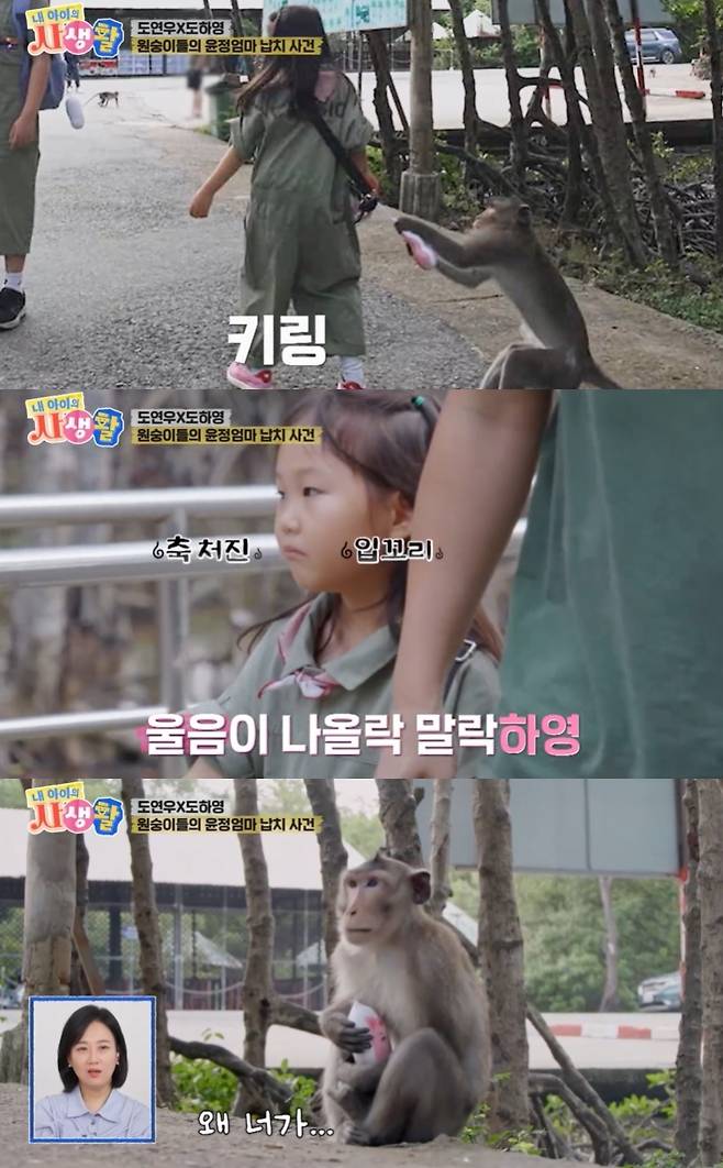 겁없이 원숭이에게 다가간 하영. 그런데 눈 깜짝할 사이 원숭이가 다가와 키링을 강탈하는 상황이 벌어졌다.
