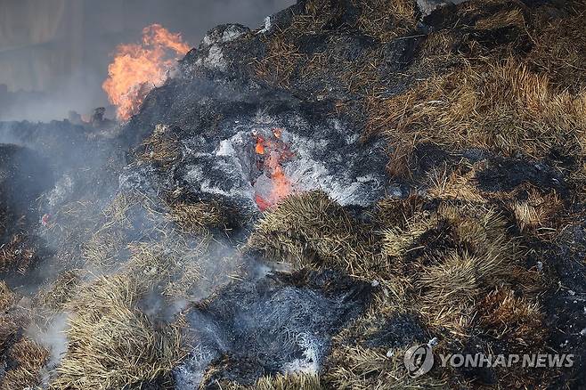 (안동=연합뉴스) 박세진 기자 = 31일 경북 안동시 남후농공단지가 산불로 피해를 본 가운데 한 공장에 있는 사료 등이 여전히 불에 타고 있어 소방 당국이 진화 작업을 벌였다. 2025.3.31