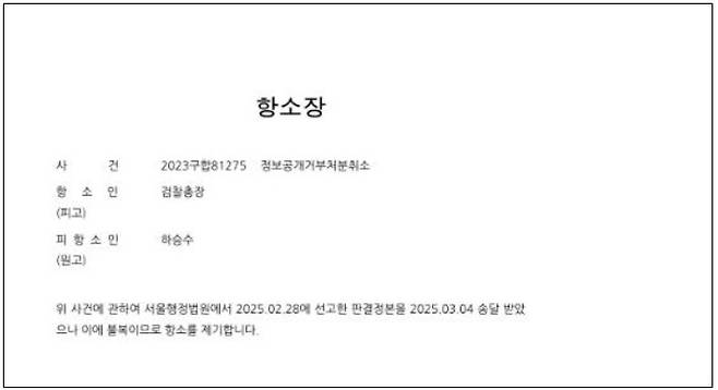 | ▲ 2025년 3월 13일 심우정 검찰총장이 필자를 상대로 낸 항소장 |