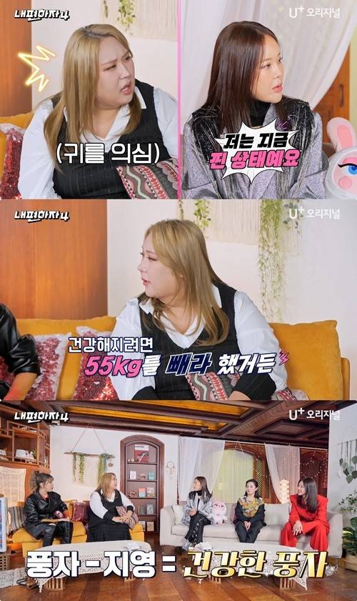 그런 가운데 여전히 50kg대를 유지 중인 백지영과 한혜진이 다이어트의 어려움에 대한 대화를 나누자 풍자는 "나는 건강해지려면 55kg을 빼야 한다는 말을 들었다”면서 "내 몸에서 백지영 언니가 나가야 한다”는 예상치 못한 멘트로 현장을 폭소로 물들였다.