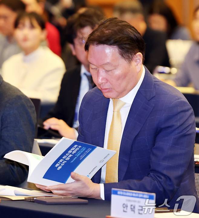 (서울=뉴스1) 허경 기자 = 최태원 대한상공회의소 회장이 31일 서울 중구 대한상의에서 열린 제7회 탄소중립과 에너지 정책 세미나에서 책자를 보고 있다. 2025.3.31/뉴스1
