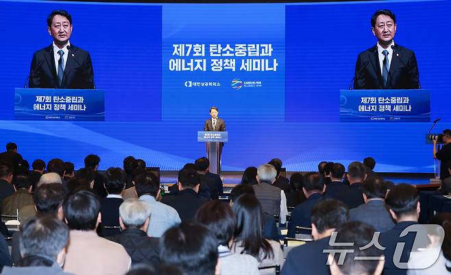(서울=뉴스1) 허경 기자 = 안덕근 산업통상자원부 장관이 31일 서울 중구 대한상의에서 열린 제7회 탄소중립과 에너지 정책 세미나에서 축사를 하고 있다. 2025.3.31/뉴스1