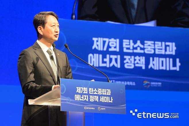 [포토] 탄소중립과 에너지 정책 세미나, 축사하는 안덕근 장관
