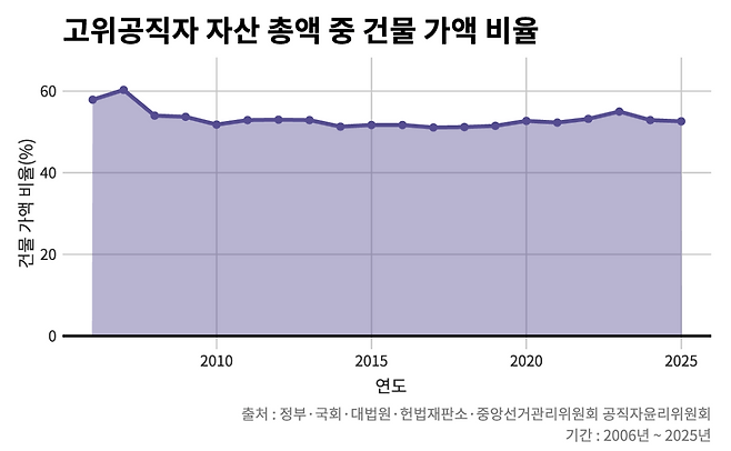 2006년 이후 장기간에 걸친 공직자들의 자산 포트폴리오에서 건물 비중은 평균 50% 아래로 떨어진 적이 없었다. 고위 공직자가 10억 원의 자산을 신고했다면, 5억 원 이상은 아파트 등 건물이었다는 의미다.