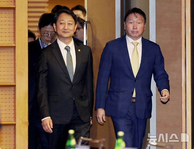 [서울=뉴시스] 김진아 기자 = 안덕근(왼쪽) 산업통상자원부 장관과 최태원 대한상의 회장이 31일 서울 중구 대한상공회의소에서 열린 '제7회 탄소중립과 에너지 정책 세미나'에 참석하고 있다. 2025.03.31. bluesoda@newsis.com