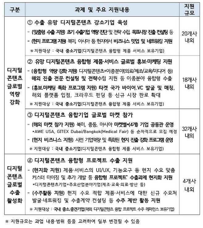 또 의료, 제조, 교육, 미디어 등 다양한 분야에서 디지털콘텐츠를 접목한 약 18개 기업을 선정해 해외 진출 전략 컨설팅을 제공한다. 또한, 목표 시장에 맞춘 홍보(플랫폼 입점, 크라우드 펀딩 등), 바이어·벤처캐피탈(VC) 발굴 및 매칭 등을 통해 판로 개척을 적극 지원한다.