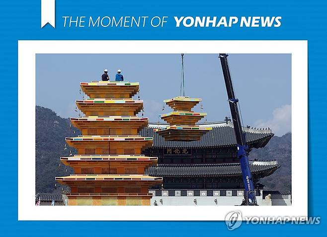 (서울=연합뉴스) 한상균 기자 = 31일 서울 광화문광장에서 부처님오신날 조형물 설치 관계자들이 탑을 조립하고 있다. 2025.3.31 [THE MOMENT OF YONHAPNEWS]