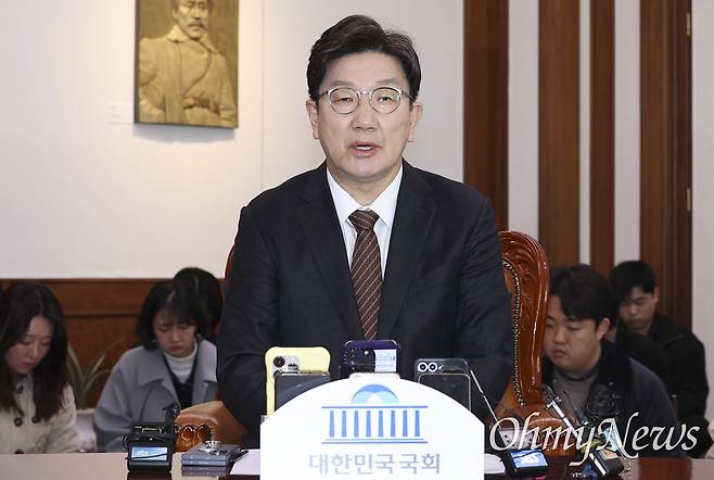 | ▲ 권성동 국민의힘 원내대표가 31일 오전 국회 의장실에서 열린 의장 주재 여야 원내대표 회동에서 발언하고 있다. |