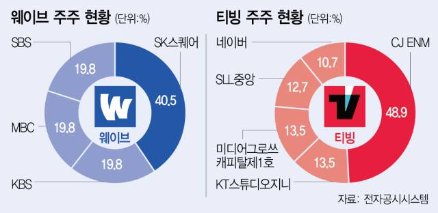 티빙과 웨이브는 최근 들어 KT스튜디오지니의 동의와 별개로 합병 속도를 높이기 위한 작업을 속속 해왔다. SK스퀘어(402340)는 웨이브 신임 대표로 이헌 매니징디렉터(MD)를 선임했다. 2022년부터 웨이브 이사로 재직해 KBS(웨이브 지분율 19.8%), MBC(19.8%), SBS(034120)(19.8%)는 물론 티빙 측 주주인 CJ ENM(035760)(48.9%), KT스튜디오지니(13.5%), 미디어그로쓰캐피탈제1호(13.5%), SLL중앙(12.7%), 네이버(10.7%) 등과 긴밀한 소통이 가능한 인물이기 때문이다. 웨이브 1대주주인 SK스퀘어와 티빙 최대주주인 CJ ENM은 지난해 11월 각각 1000억 원, 1500억 원을 웨이브에 투자하기도 했다. 자금난을 겪던 웨이브를 긴급 지원하기 위해서다.