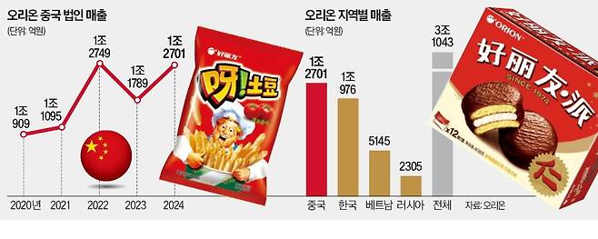 31일 오리온에 따르면 지난해 중국 법인 매출은 1조2701억원으로 5년 연속 1조원을 넘어섰다. 그룹 전체 매출의 41%를 중국에서 올렸다. 베트남(5145억원), 러시아(2305억원)는 물론이고 한국 매출(1조976억원)보다 많다. 중국 법인의 탄탄한 실적은 지난해 오리온이 1956년 창사 이후 처음으로 매출 3조원 시대를 열게 해준 기반이다.