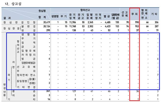 | ▲ 법원행정처에서 발간한 <2024 사법연감> 통계에 따르면, 2023년 형사공판사건 가운데 상고심 기각이 4707건(94.4%), 파기 281건으로 파기율(파기건수/판결건수)은 5.6%였다. 이 가운데 파기자판은 모두 17건으로 전체 판결건수 가운데 0.3%에 그쳤다. 원심 무죄인 990명(빨간 상자) 가운데 '파기환송'이 36명이었고, '파기자판'(파란 상자)은 0명이었다. |