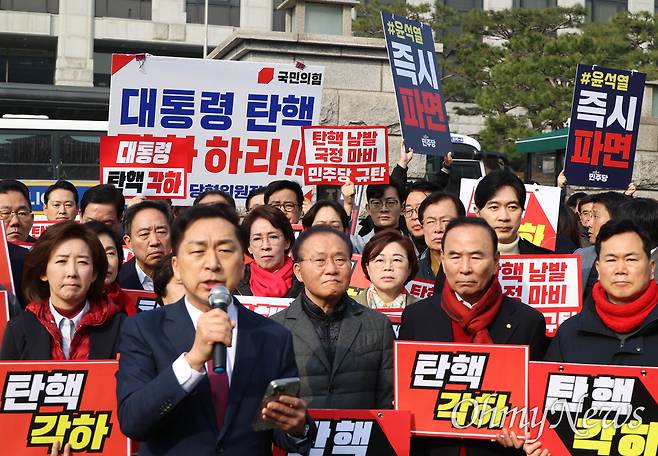 | ▲ 21일 오전 서울 종로구 헌법재판소앞에서 국민의힘 김기현, 나경원, 추경호, 윤상현 의원 등이 참석한 가운데, 윤석열 대통령 탄핵 각하 촉구 기자회견이 열렸다. 뒤쪽에서는 파면을 촉구하는 더불어민주당 의원들의 기자회견이 동시에 열리고 있다. |