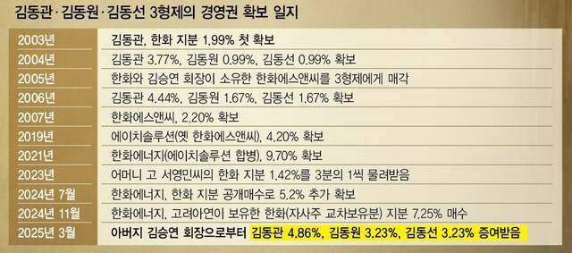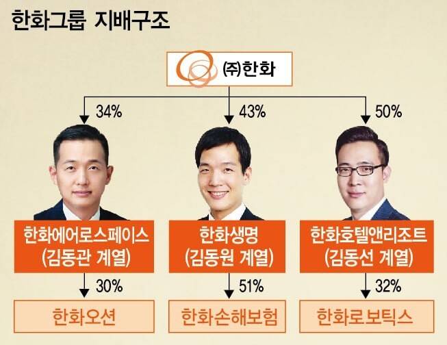 증여 뒤 세 아들의 ㈜한화 지분율은 김동관 부회장 9.77%, 김동원 사장 5.37%, 김동선 부사장 5.37% 등 20.51%로 올라간다. 여기에 세 아들이 지분 100%를 보유한 한화에너지(22.16%) 지분을 더하면 이들의 ㈜한화 지분율은 42.67%로 확대된다. 김 부회장 등 삼형제는 사실상 사업별로 나눠 그룹을 이끌고 있다. 김 부회장은 그룹 전반과 에너지·방산 부문을, 둘째 김동원 사장은 한화생명 등 금융계열사, 김동선 부사장은 한화갤러리아 등 유통 부문을 맡고 있다. 앞으로 삼형제를 중심으로 한 사업 분할 등의 후속 작업이 이어질 공산이 있는 셈이다.