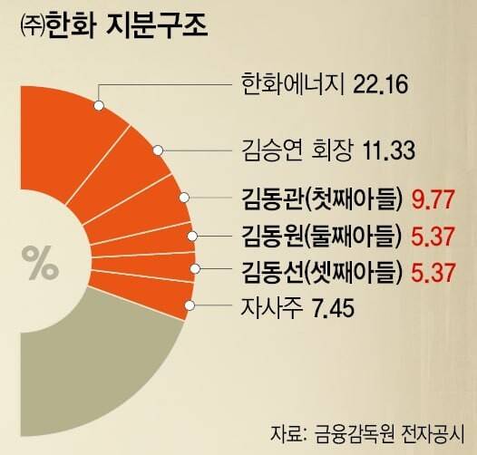 ㈜한화는 31일 김 회장이 보유한 이 회사 지분 22.65%(이하 보통주 기준)의 절반인 11.32%를 김동관 한화그룹 부회장·김동원 한화생명 사장·김동선 한화갤러리아 부사장 등 3명에게 증여하기로 했다고 밝혔다. 김 부회장이 4.86%, 김 사장과 김 부사장이 3.23%씩을 각각 물려받는다.