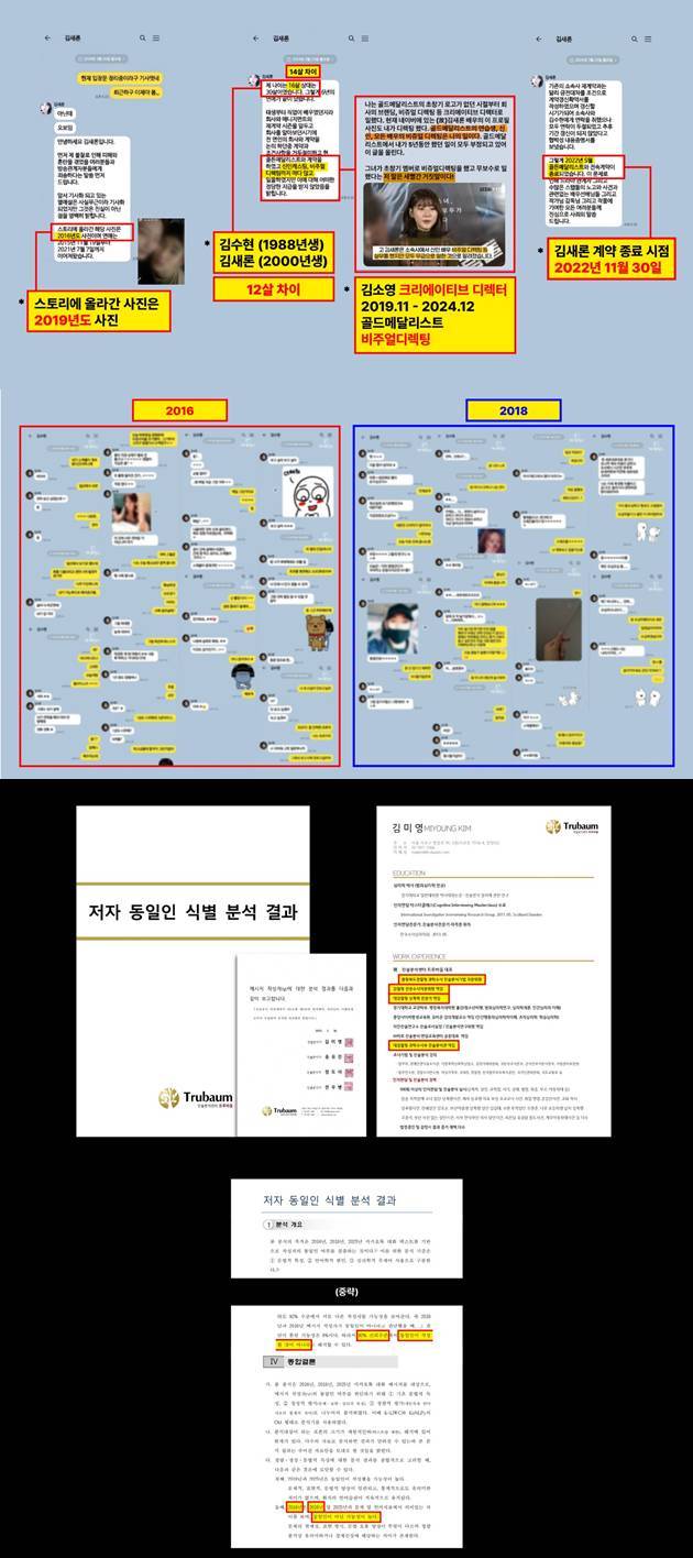 "유튜브 채널에서는 2016년에 있는 카톡들을, 카톡에 있는 발언들을 증거로 저에게 소아성애자, 미성년자 그루밍, 이같은 프레임을 씌우고 있습니다. 그러나 2016년 카톡과 2018년 카톡에서 고인과 대화하고 있는 인물들은 서로 다른 사람입니다. 저는 이 사실을 증명하고자 유족이 제출한 2016년과 2018년, 그리고 올해 제가 지인들과 나눈 카톡을 과학적으로 진술을 분석하는 검증기관에 제출했습니다. 그 결과 해당 기관은 보시는 것처럼 2016년과 2018년의 인물이 같은 사람이 아니란 결론을 내렸습니다."