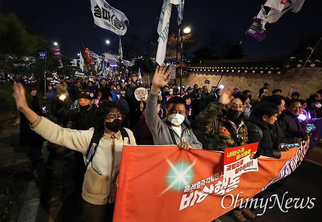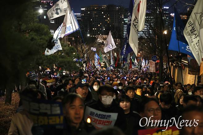 | ▲ 31일 오후 서울 종로구 광화문앞에서 열린 ‘내란수괴 윤석열 즉각 파면 행진’에 참석한 시민들이 한덕수 대통령 권한대행 국무총리 관저 부근인 청와대 춘구관앞까지 행진하며 ‘마은혁 헌법재판관 임명’ ‘윤석열 즉각 파면’을 요구하고 있다. |