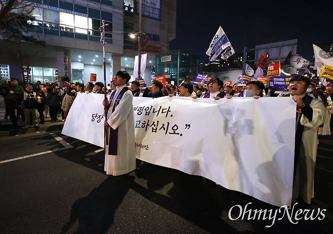 31일 오후 서울 종로구 광화문앞에서 열린 '내란수괴 윤석열 즉각 파면 행진'에 참석한 시민들이 헌법재판소를 향해 행진하는 가운데, 열린송현 녹지광장에서 시국미사를 개최한 천주교정의구현사제단 신부들이 행진에 합류해 대열 선두에 섰다.