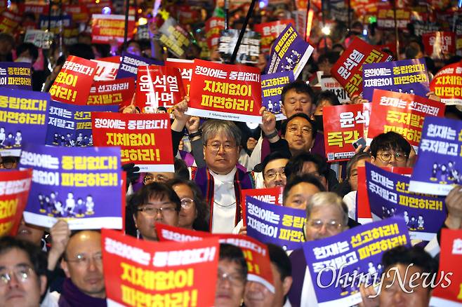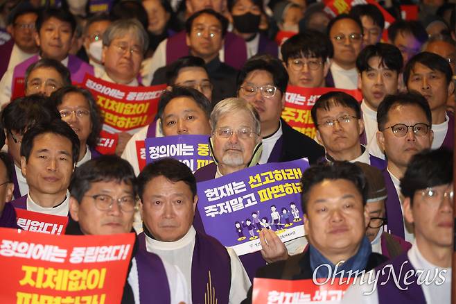 | ▲ 31일 오후 서울 종로구 광화문앞에서 열린 ‘내란수괴 윤석열 즉각 파면 행진’에 참석한 시민들이 헌법재판소를 향해 행진하는 가운데, 열린송현 녹지광장에서 시국미사를 개최한 천주교정의구현사제단 신부들이 행진에 합류해 대열 선두에 섰다. |