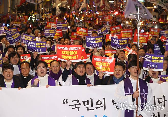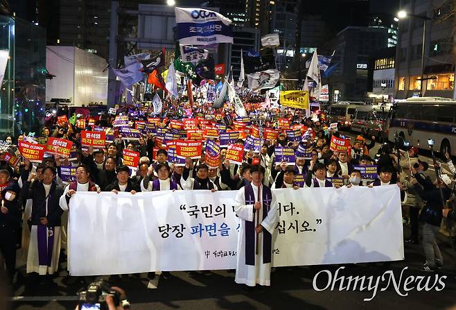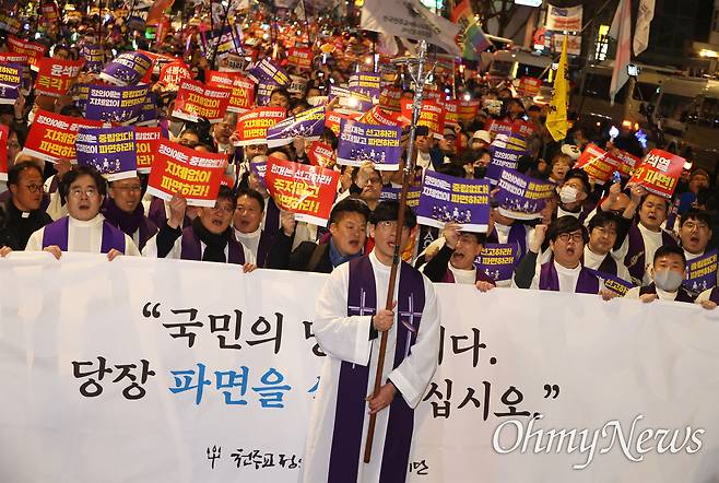 [오마이포토] 십자가 앞에운 시국미사 신부들, 시민과 함께 헌법재판소까지 행진